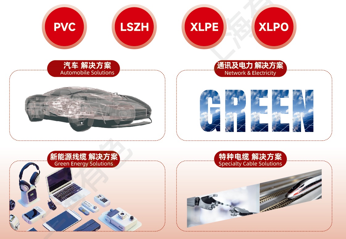 美昱利用尖端技术提供多功能 PVC、LSHF低烟无卤聚烯烃和 TPE 化合物,应用领域覆盖各行各业,包括轨道交通,新能源,工业电缆,建筑,家用电子等市场。