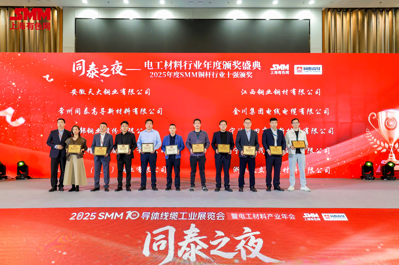11月6日,在由常州同泰高导新材料有限公司、SMM、山东爱思信息科技有限公司主办,上海场外大宗商品衍生品协会特邀协办,江苏鑫海高导新材料有限公司、东吴期货有限公司支持,上海市电线电缆行业协会特邀支持以及众多代表企业鼎力支持的2025SMM(第十届) 导体线缆工业展览会暨电工材料产业年会的晚宴现场,为获奖企业举行了隆重的颁奖仪式。